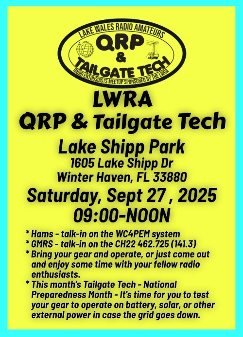 This will be in Lake Aston in Lake Wales , hosted by Tom KA8JIL. A pavilion has been secured and at least one station ready for the event. If you are interested in joining him, contact information is – 614-314-4360 he is also on the LWRA Club Swap Signal page.